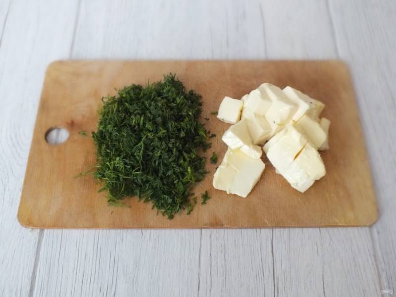 Нарежьте мелко укроп. Сыр нарежьте небольшими кубиками.