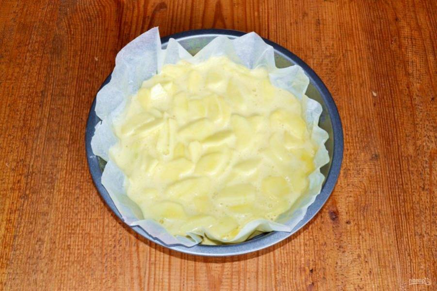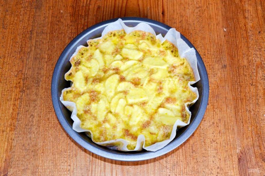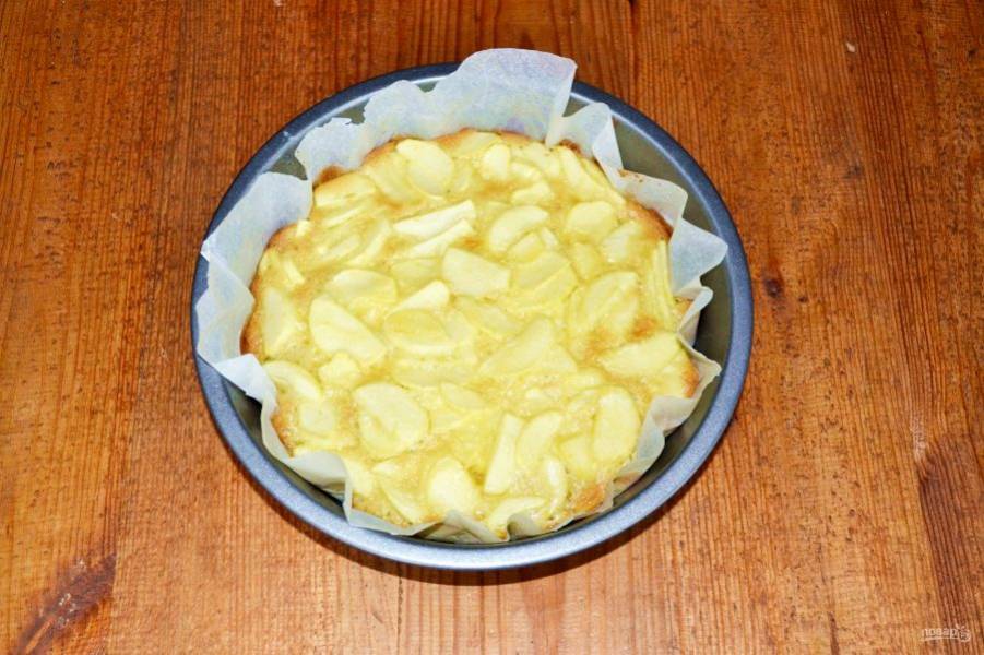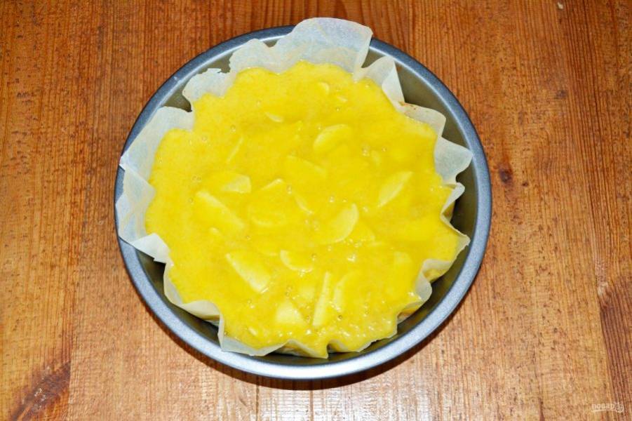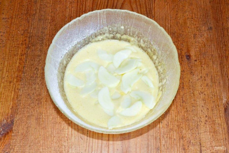 Яблоки очистите и нарежьте тонкими пластинками. Выложите в тесто.