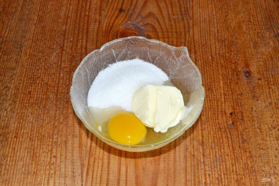 Для приготовления заливки соедините яйцо, сахар и сливочное масло. Взбейте до однородности.