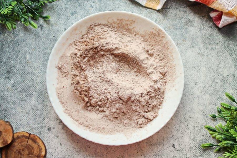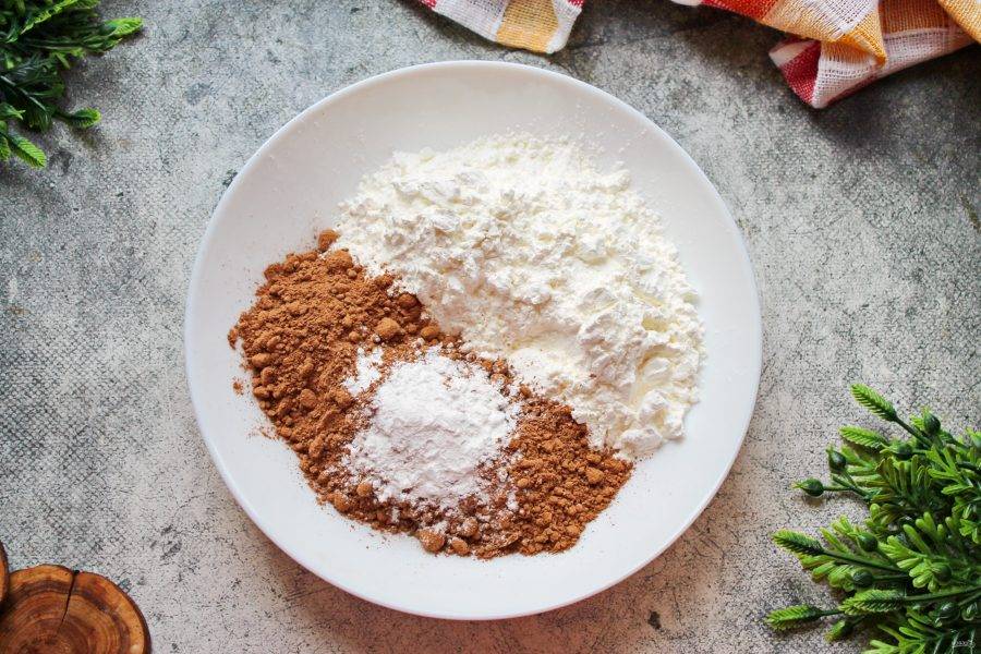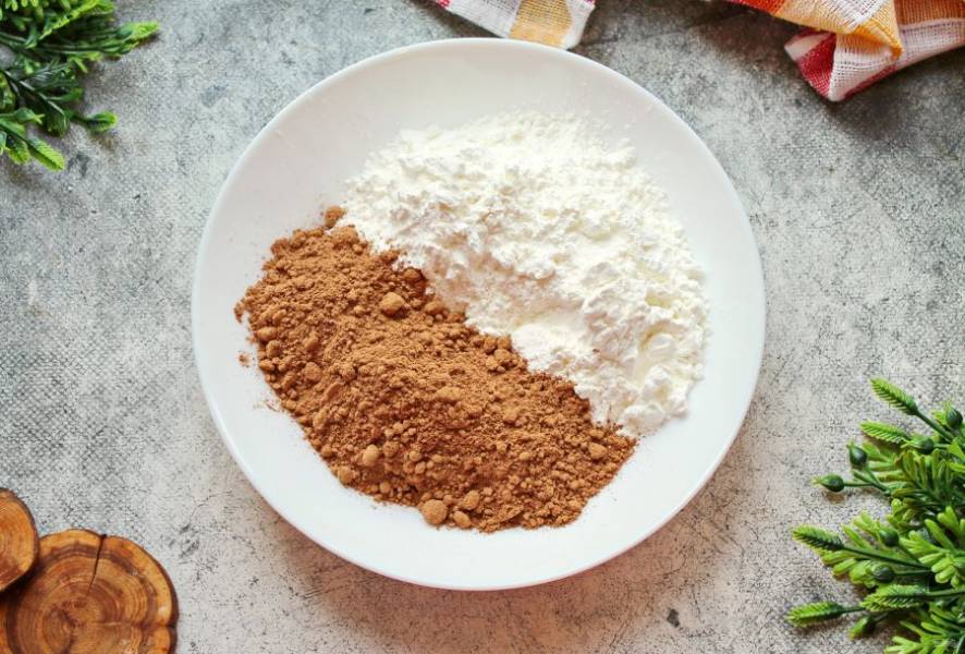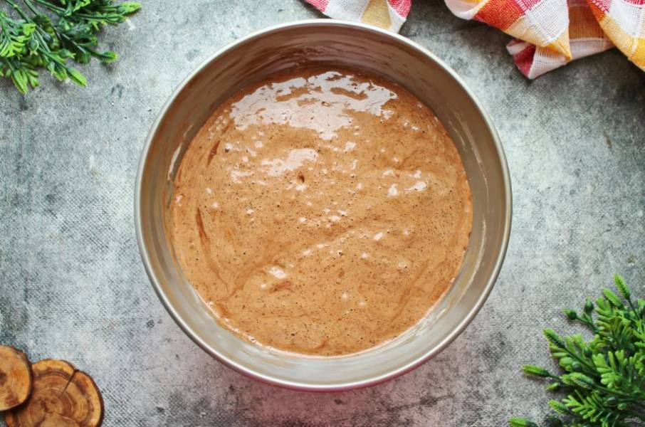 Частями добавляйте муку с какао и аккуратно перемешайте до однородного, без комочков, теста. Не стоит долго его мешать, тесто осядет и будет плотное.