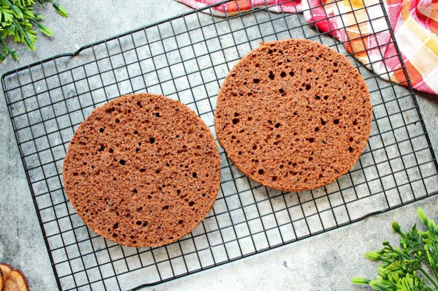 Переставьте готовый бисквит на решетку и полностью остудите в кольце. Если хотите сделать тортик, заверните бисквит в пленку и дайте полежать в холодильнике 4-6 часов. Или подавайте к чаю сразу после остывания.