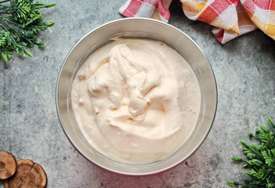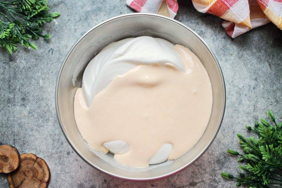 Очень аккуратно перемешайте лопаткой обе массы до однородности. Влейте холодное молоко и снова аккуратно перемешайте.