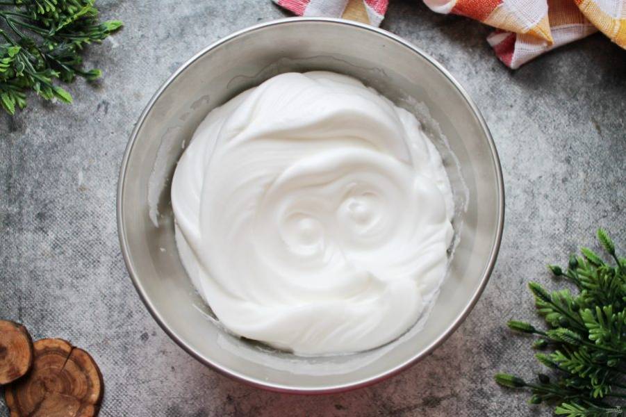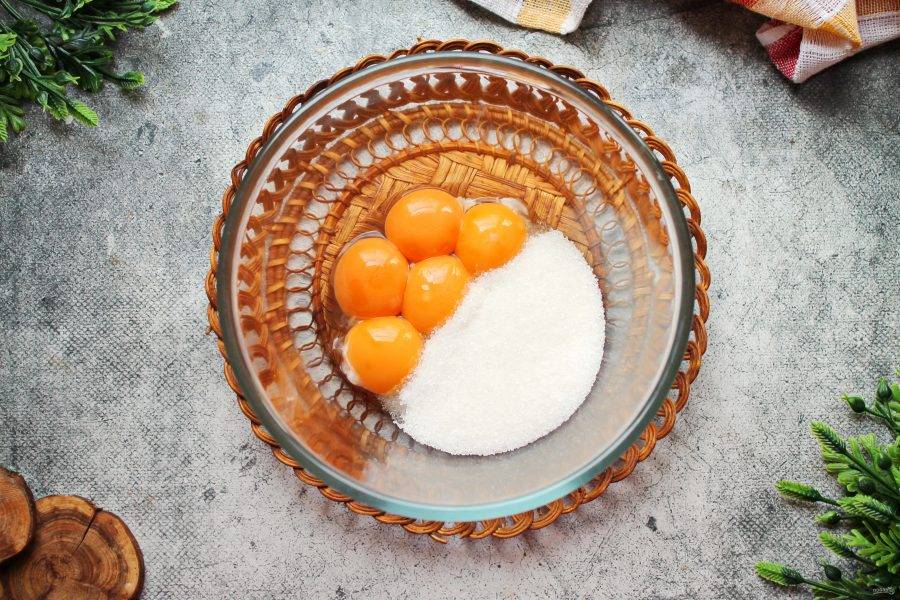 В желтки добавьте фруктозу и взбейте все до растворения крупинок и пышной светлой массы.