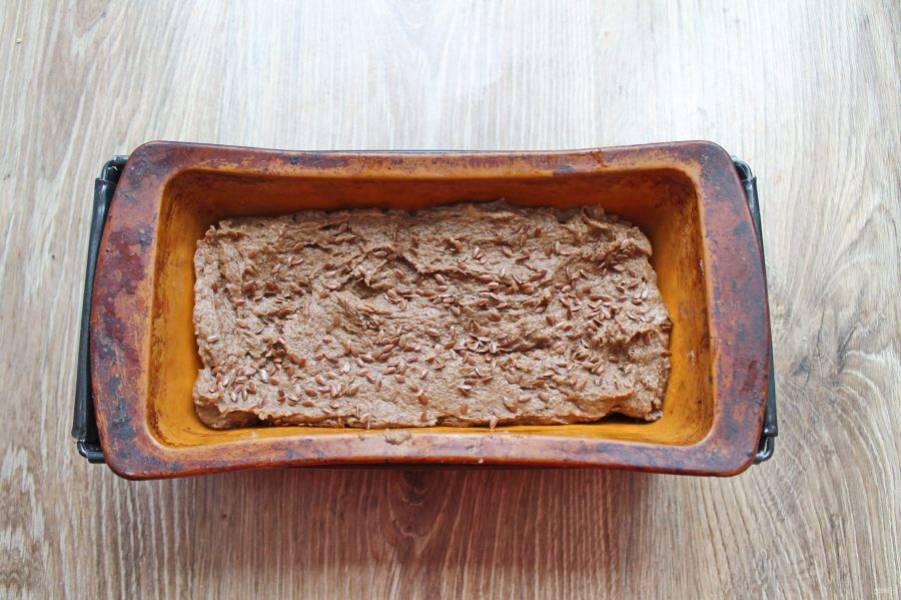 В форму для выпечки размером 12*22 сантиметра переложите тесто и разровняйте. При желании можно посыпать верх семенами льна.