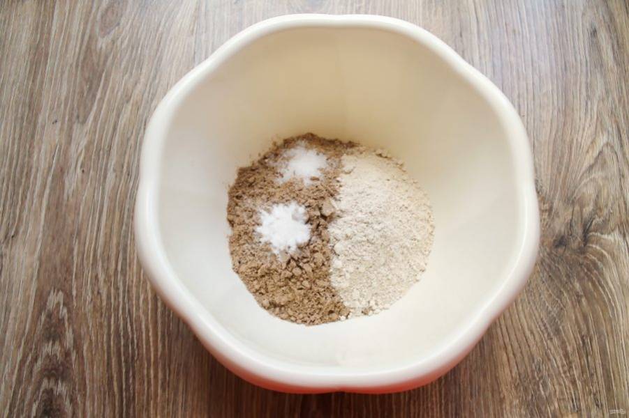 В миску выложите овсяную и льняную муку. Добавьте соль и разрыхлитель, перемешайте.