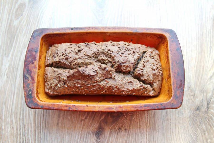 Поставьте в горячую духовку и выпекайте при температуре 180 градусов в течение 40-50 минут, до готовности. Готовность теста можно проверить при помощи деревянной шпажки. Если проткнуть ей хлеб и при извлечении она будет сухой, хлеб готов. Достаньте из духовки, дайте постоять 5-10 минут и извлеките хлеб. Дайте ему полностью остыть на решетке.