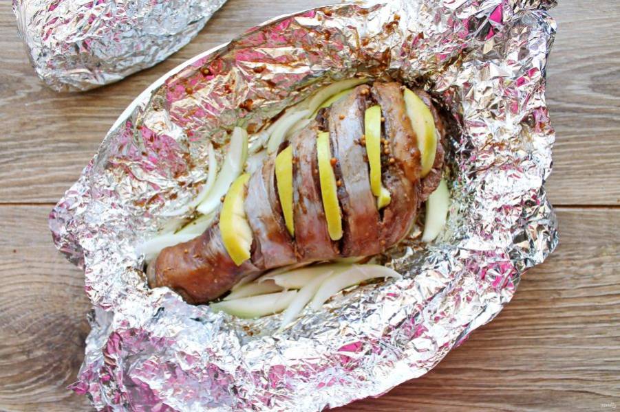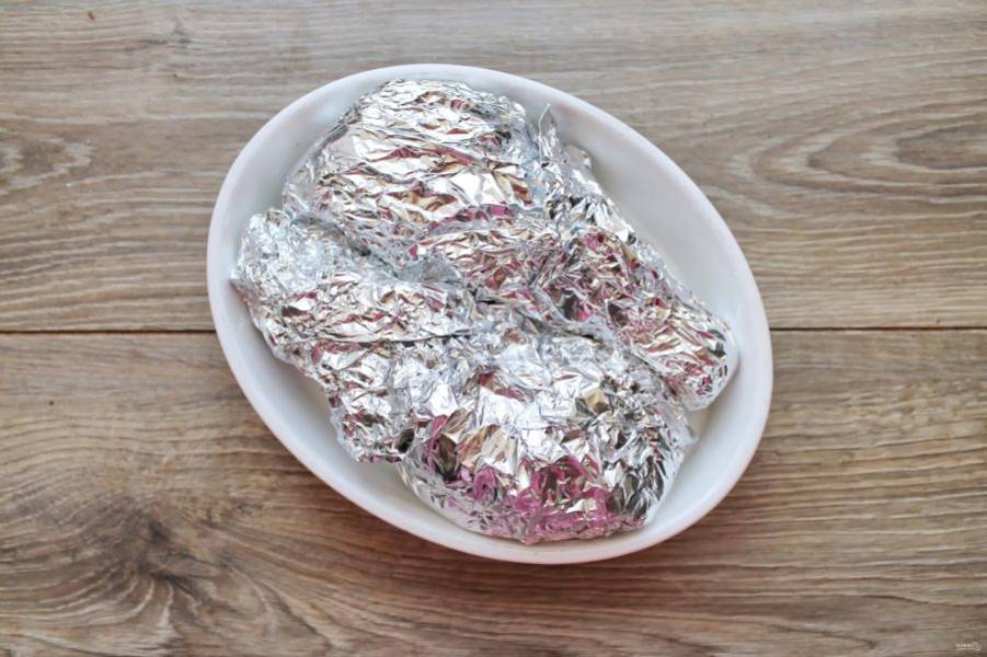 Тщательно заверните ножку в фольгу. То же самое сделайте со второй ножкой и выложите их в форму для запекания.