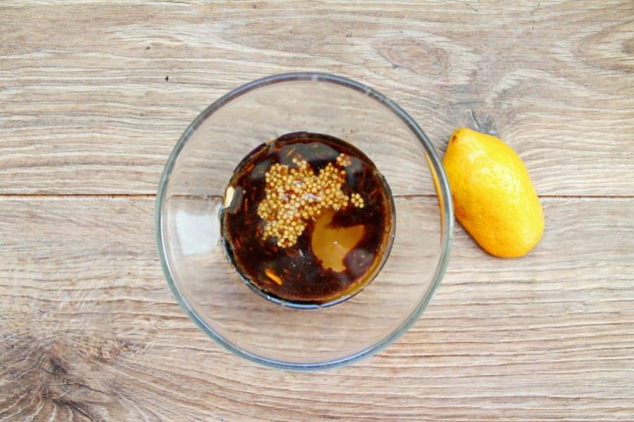 В миске смешайте соевый соус, мед, горчицу, лимонный сок, растительное масло, перец и перемешайте.