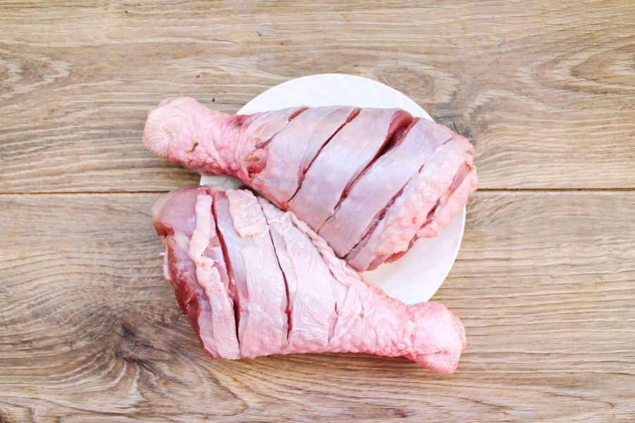 Ножки индейки вымойте, обсушите и сделайте надрезы по всей длине, посолите.