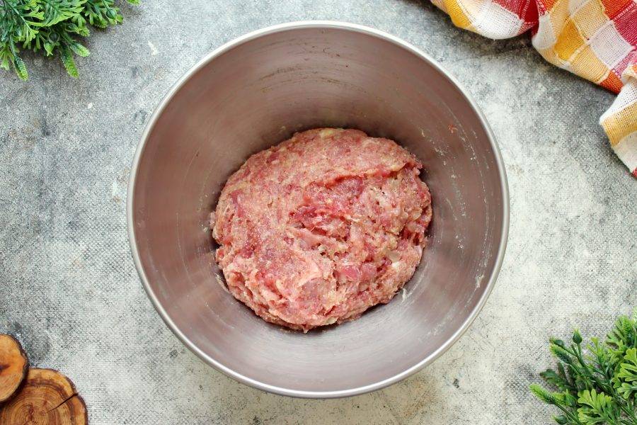 Добавьте к фаршу воду и тщательно перемешайте, после этого отбейте фарш до плотного состояния. Для этого соберите фарш в руку, поднимите над миской и бросьте обратно. Сделайте так 10-15 раз.