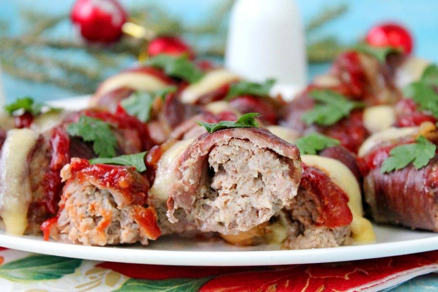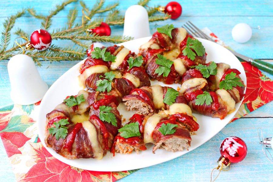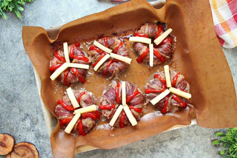 Сыр порежьте полосками по три штуки на каждое кольцо. Противень с новогодними котлетами достаньте, сделайте полоски из кетчупа и выложите полоски сыра. Верните противень в духовку еще на 5-7 минут, достаньте, украсьте зеленью и подавайте к столу.