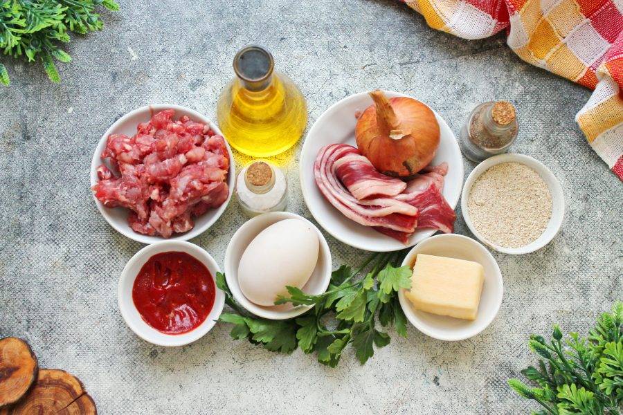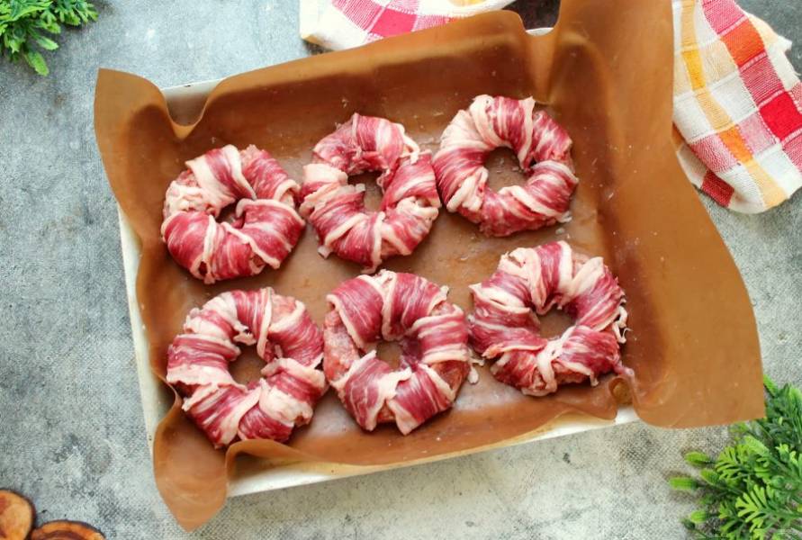 Обверните каждое кольцо беконом и выложите на противень с пергаментом.