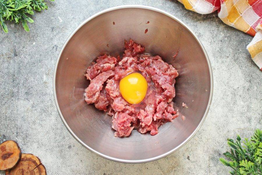 Мясной фарш, у меня смешанный свинина-говядина 1:1, выложите в миску и вбейте яйцо.