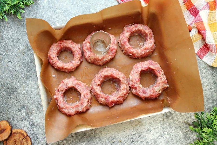 Разделите фарш на 6 частей, сформируйте шарик, а потом при помощи сырых пальцев на противне с пергаментом или силиконовом коврике сформируйте кольца. А при помощи рюмки выровните внешний и внутренний края. Уберите противень с котлетами в морозильную камеру на 1-2 часа для того, чтобы кольца замерзли и хорошо держали форму. Но они не должны полностью замерзнуть.