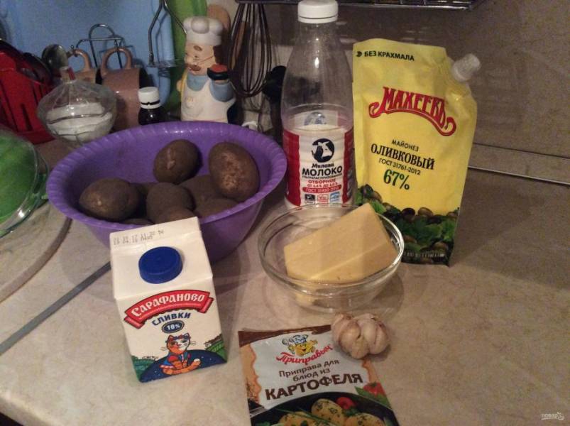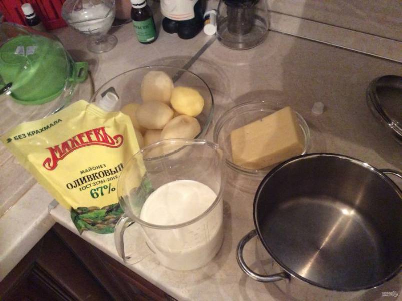 Картофель помыть, почистить и нарезать тонкими дольками. Картофель не замачивать в воде! Крахмал нам понадобится для сгущения соуса. Для соуса: смешиваем молоко, сливки и майонез "Махеевъ", ставим на средней огонь и доводим до кипения.