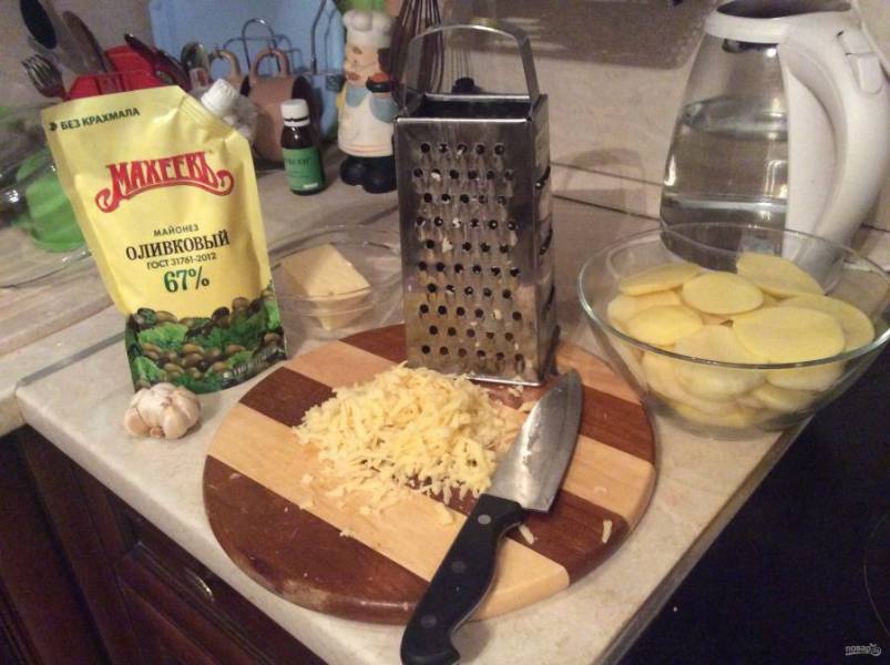 Пока готовится соус, потрем сыр и почистим чеснок.