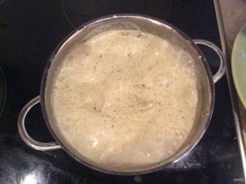 Когда соус начинает закипать, добавить туда картофель и перемешать так, чтобы картофель покрылся сливками. Затем добавить приправу по вкусу. Затем убавить огонь, варить около 10 минут, обязательно помешивая, чтобы смесь не пристала к кастрюле, как у меня :( Минуты за 2 до окончания варки добавьте тертый сыр и выдавленный чеснок.