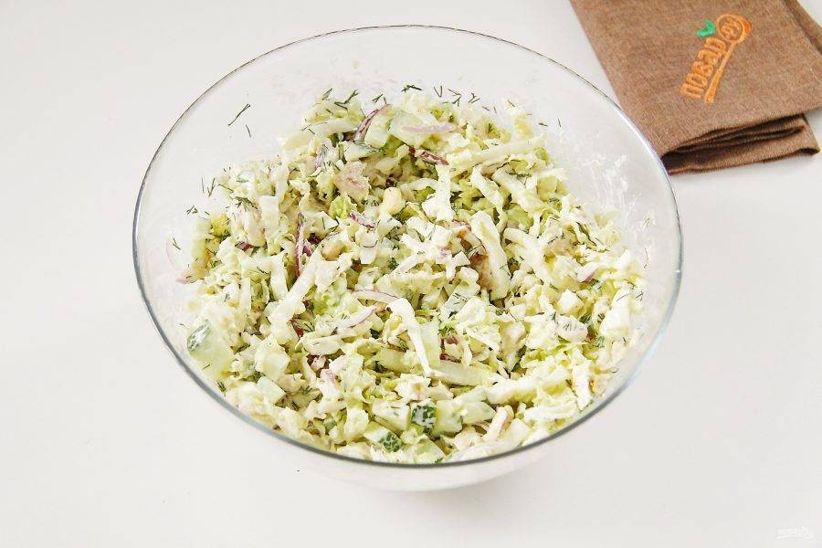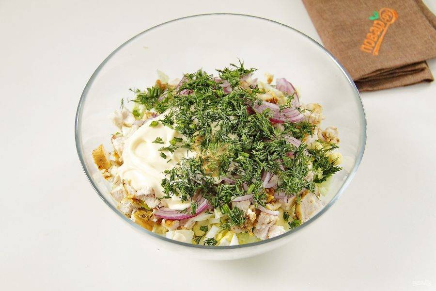 Добавьте любую свежую зелень, майонез и горчицу. Соль я не добавляла, мне хватило ее от мяса, по необходимости можете немного посолить салат.
