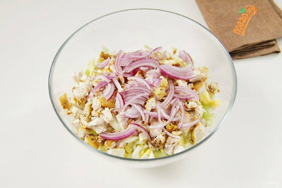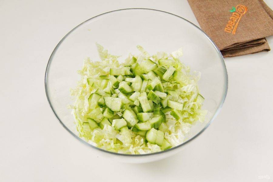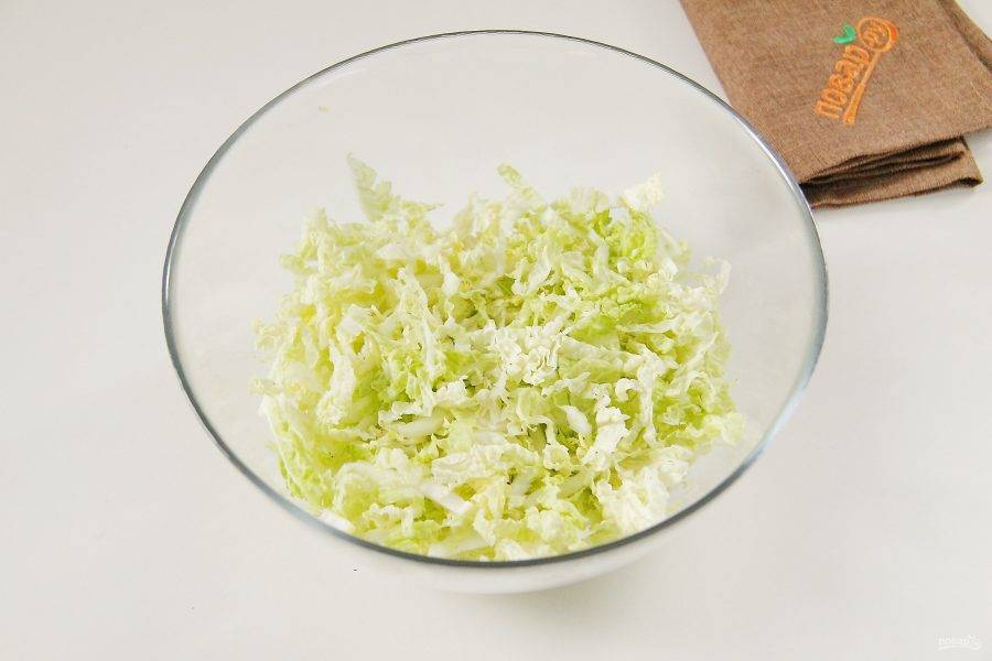 Теперь можно приступить к приготовлению салата. У капусты снимите верхние листики и тонко нарежьте. Если капуста крупная, то лучше взять половину.