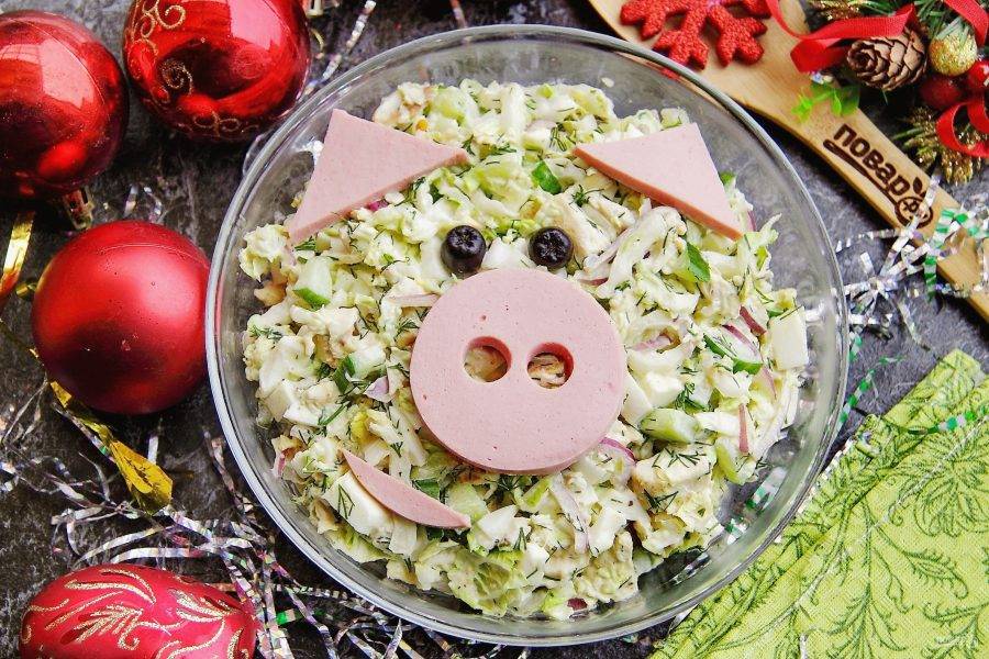 Легкий, освежающий, в тоже время вкусный и сытный салат в праздничной подаче, в виде символа года Свиньи. Салат замечательно будет смотреться на праздничном столе и несомненно будет одобрен гостями.