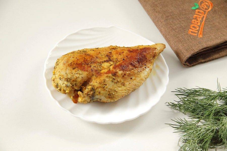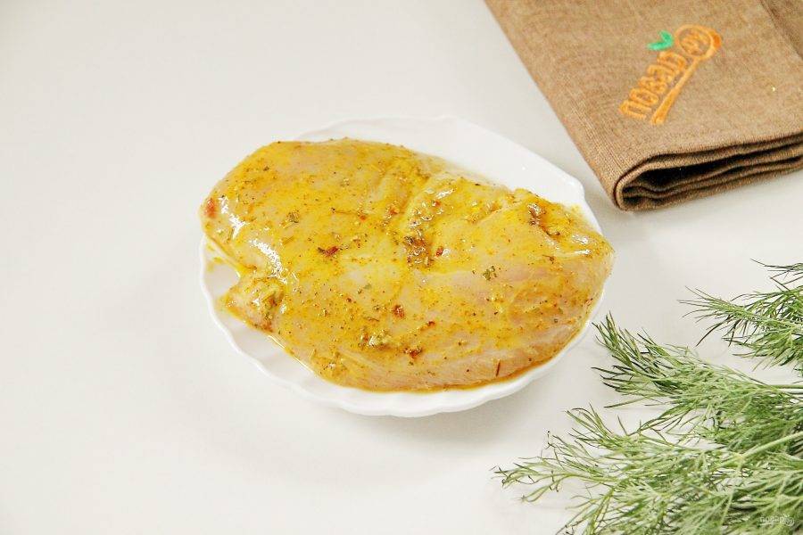 Куриное филе натрите солью и специями, сбрызните соком лимона и оставьте мариноваться на 20-30 минут.