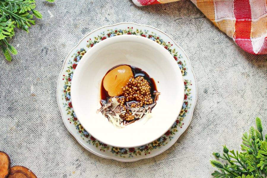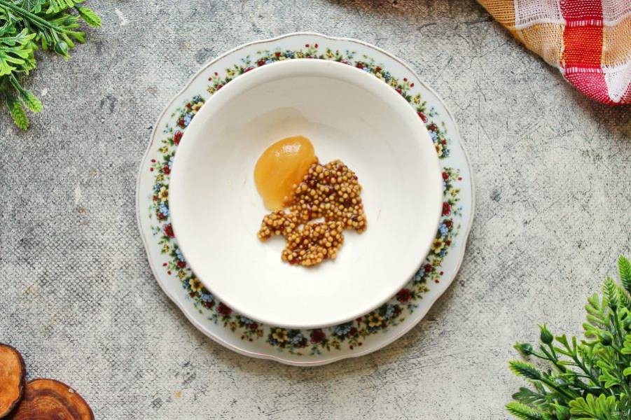 Для заправки новогоднего салата с креветками сделайте соус. В миску выложите мед и зерновую горчицу.