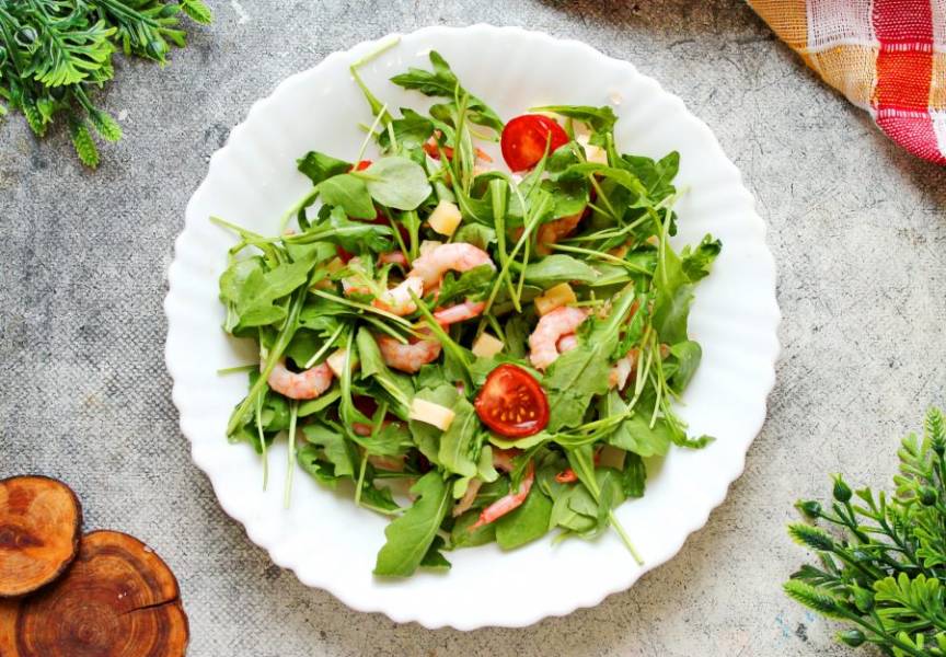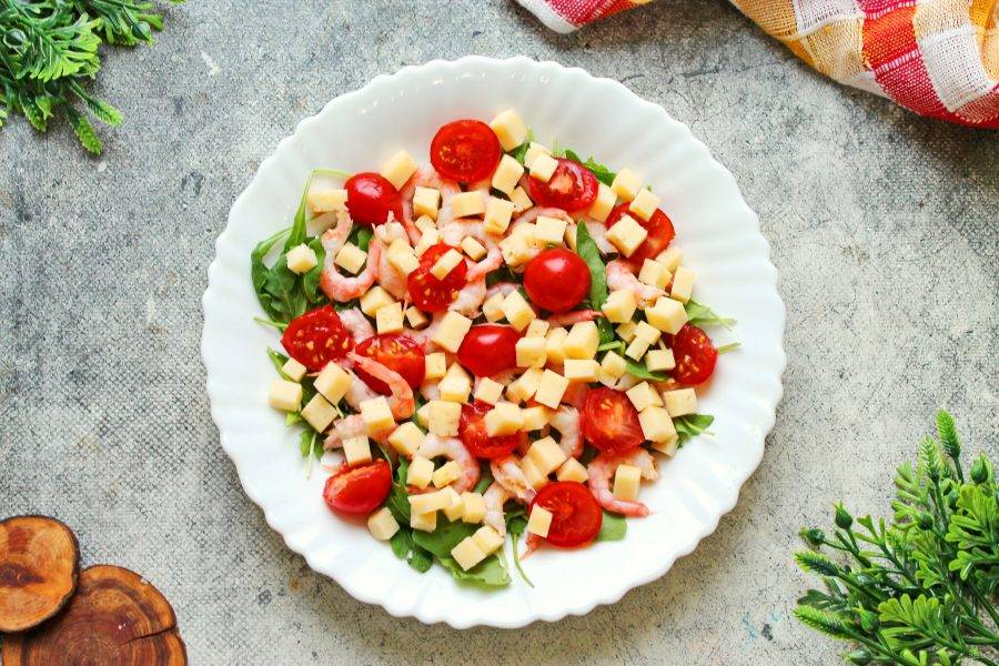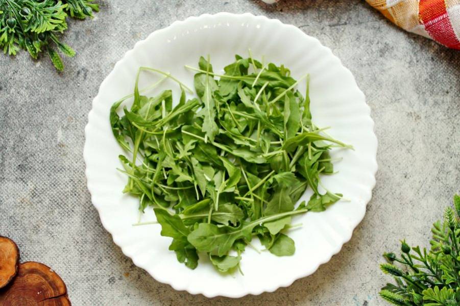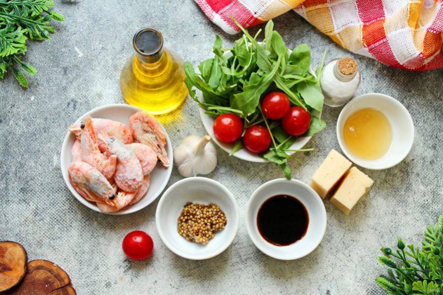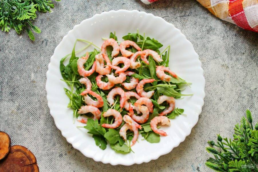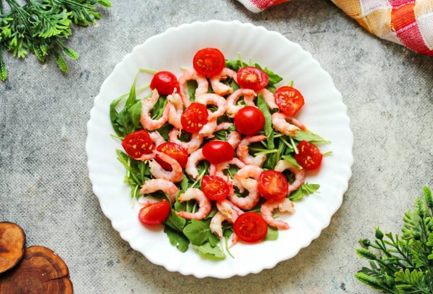 Подготовьте все ингредиенты для приготовления новогоднего салата с креветками. Переберите руколу, удаляя порченые листики и жесткие стебли, сполосните и обсушите бумажным полотенцем. Черри вымойте и вытрите насухо.