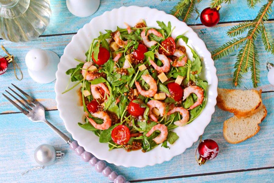 Разложите готовый салат на красивое блюдо, заправьте и сразу подавайте на стол. Новогодний салат с креветками готов. Приятного аппетита!