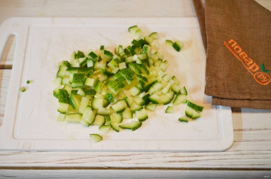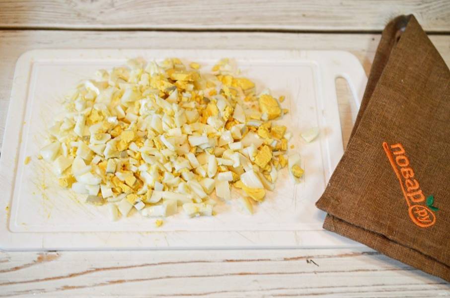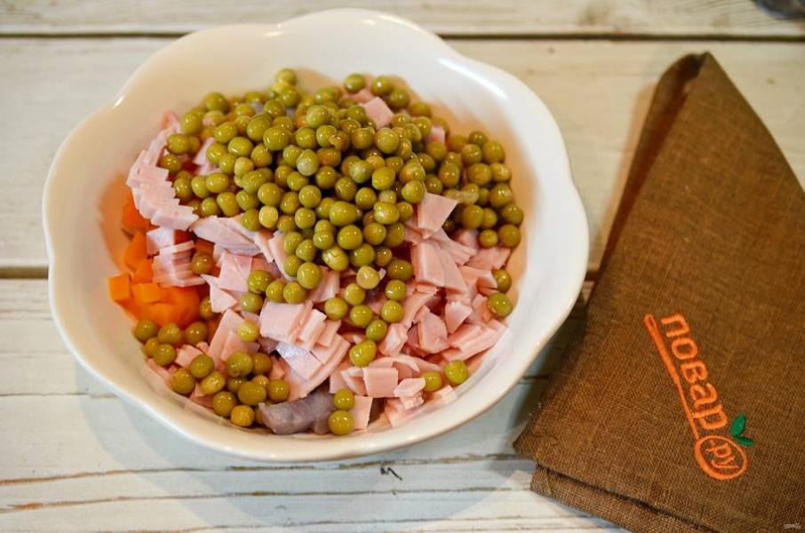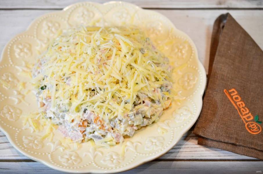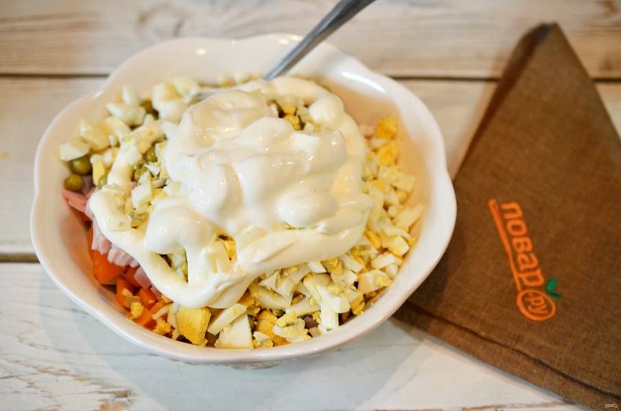 6. Заправьте смесью сметаны и майонеза. Перемешайте. Если надо, посолите.