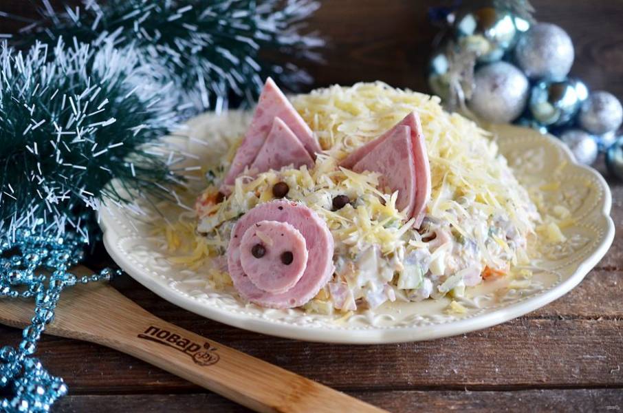 Если Вы еще размышляете на тему праздничного меню к Новому году, то рекомендую присмотреться к данному рецепту. Салат в виде символа года Свиньи порадует своим оформлением и детей, и взрослых!