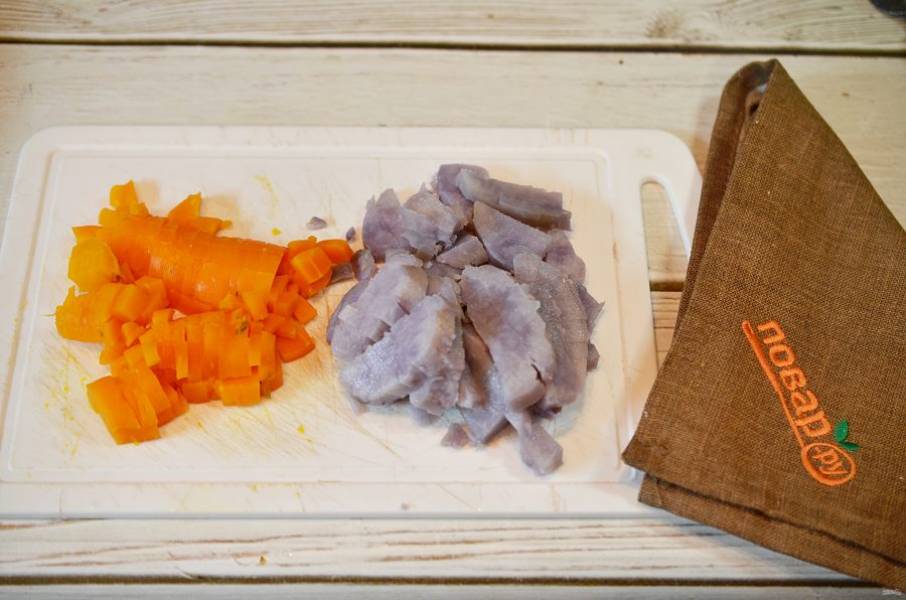 1. Морковь и картофель нарежьте мелким кубиком. Я использую фиолетовый картофель.