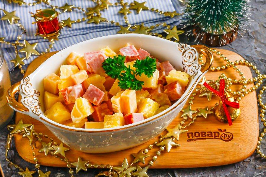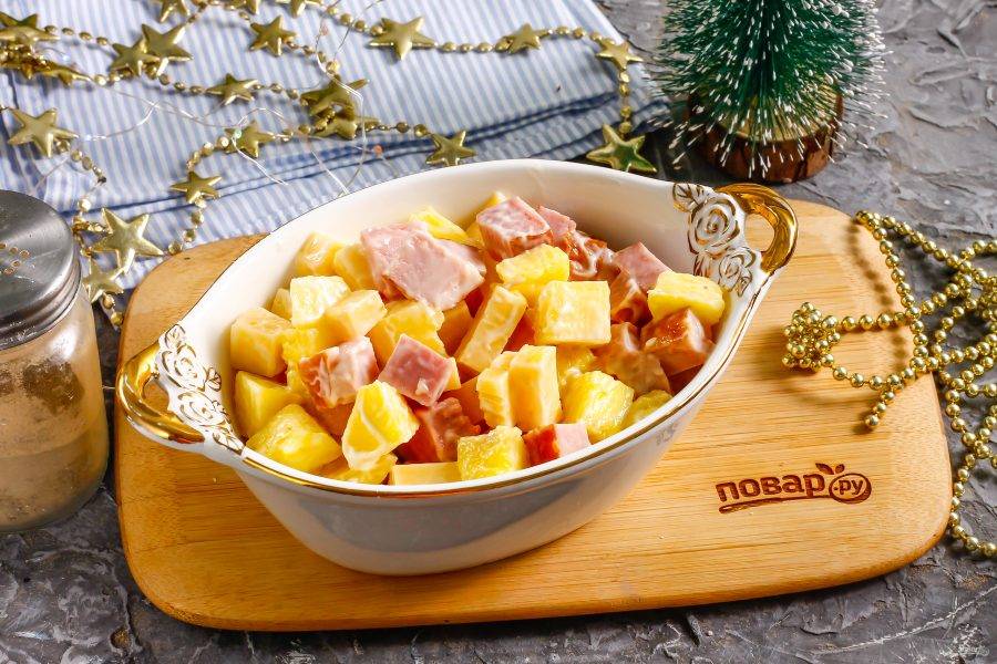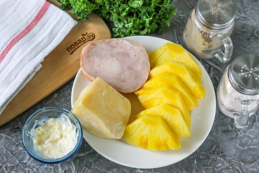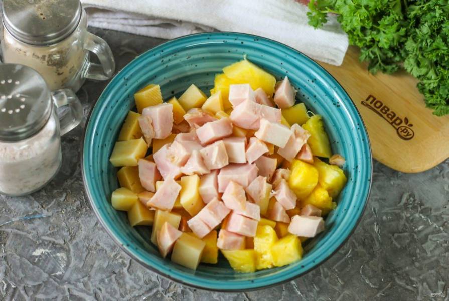 Сыр нарежьте средними кубиками. Лучше всего приобретать сыр сорта "Мраморный" или "Российский" - они мягкие на вкус. Консервированные ананасы отожмите от сиропа, нарежьте такими же кубиками и выложите в емкость к сыру.