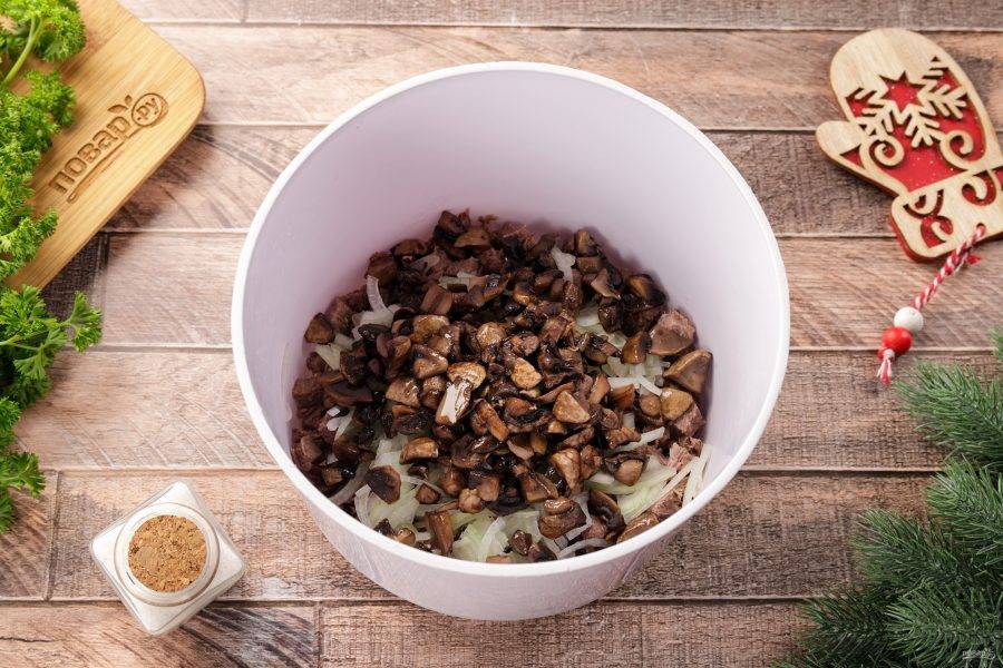 Шампиньоны нарежьте кубиками и обжарьте на растительном масле в течение 5 минут. Переложите к луку с мясом.