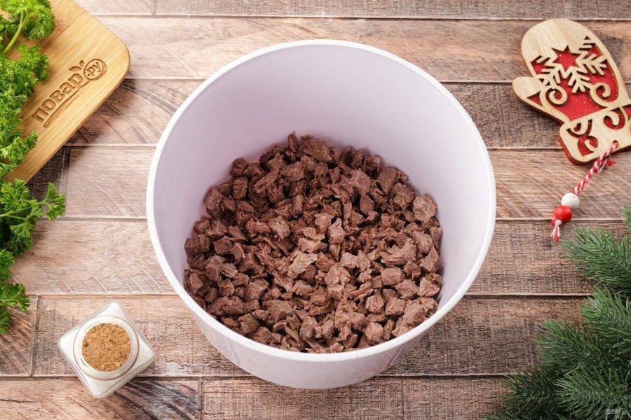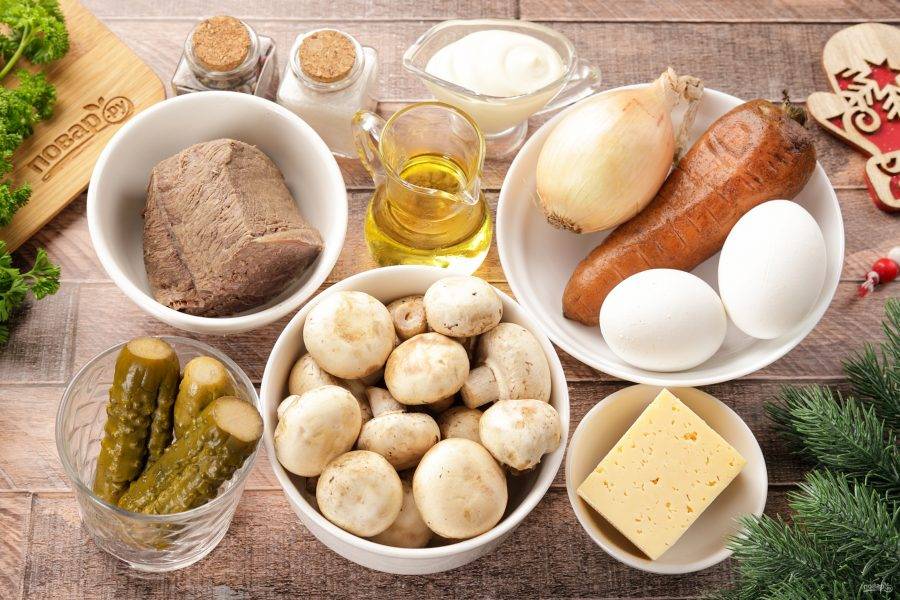 Подготовьте все ингредиенты по списку. Говядину отварите в подсоленной воде и оставьте остывать в бульоне. Морковь и яйца так же отварите заранее и дайте остыть. Говядину можно заменить на отварной язык, получается тоже очень вкусно.