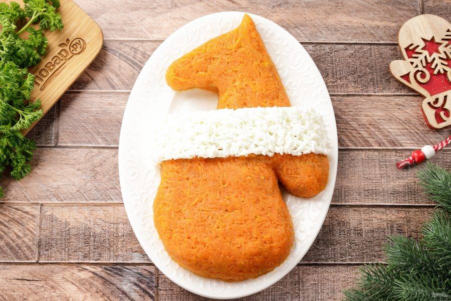 Распределите сверху тёртую на мелкой тёрке варёную морковь. Посолите немного и пригладьте ножом или вилкой. Пройдитесь по бокам, придавая салату окончательную форму. Белки варёных яиц (если яйцо крупное — хватит одного) натрите на мелкой тёрке и посыпьте на оторочку для рукавицы.