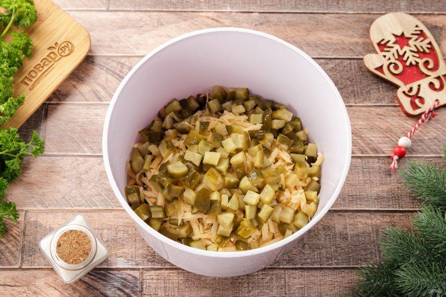 Огурцы нарежьте кубиками или небольшой соломкой.