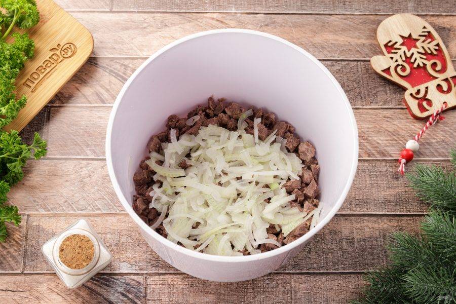 Лук нарежьте тонкими полукольцами или четвертинками. Ошпарьте кипятком, чтобы убрать горечь, откиньте на сито, а затем добавьте к мясу в миску.