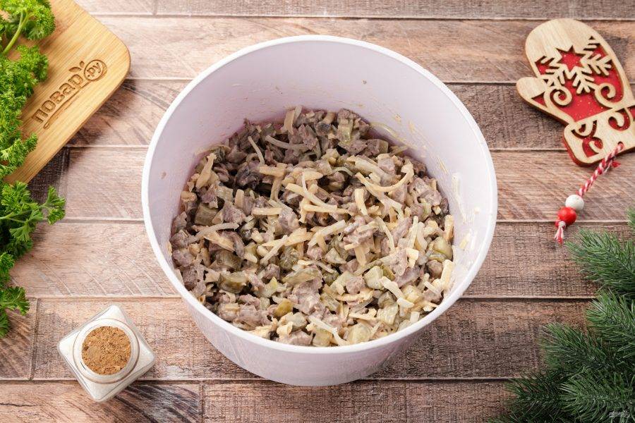 Заправьте салат майонезом. Посолите и поперчите по вкусу. Перемешайте.