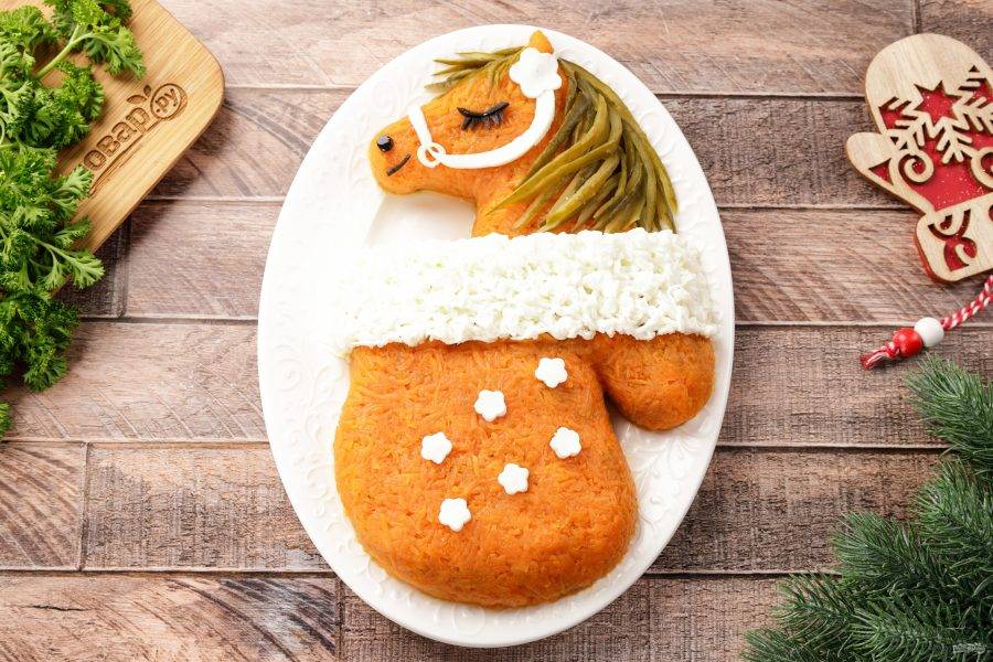Выложите салат на плоскую тарелку и придайте ему форму варежки с выглядывающей из неё головой лошади.
