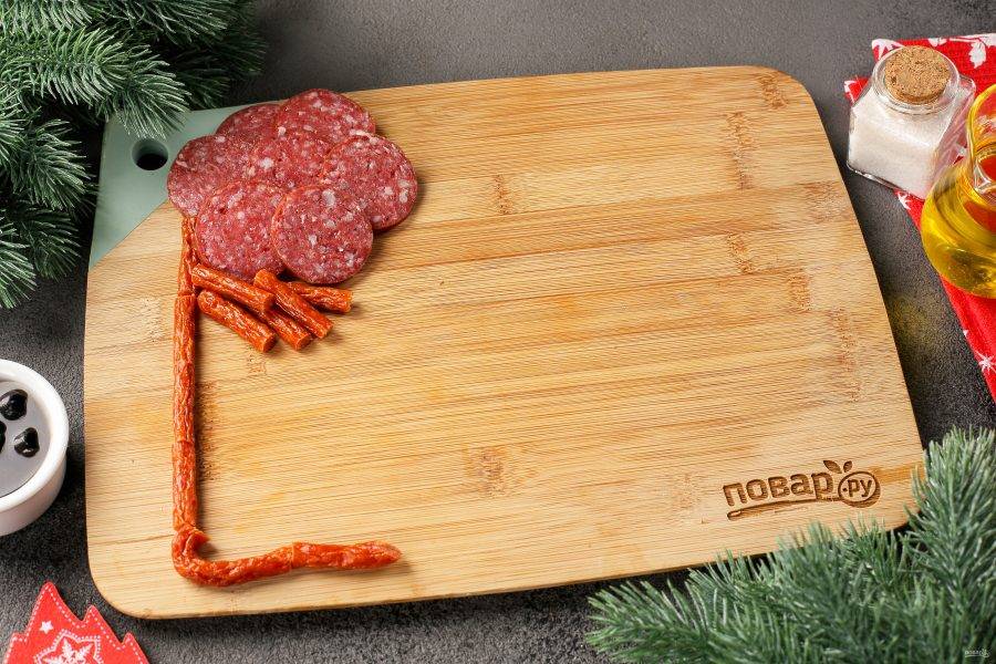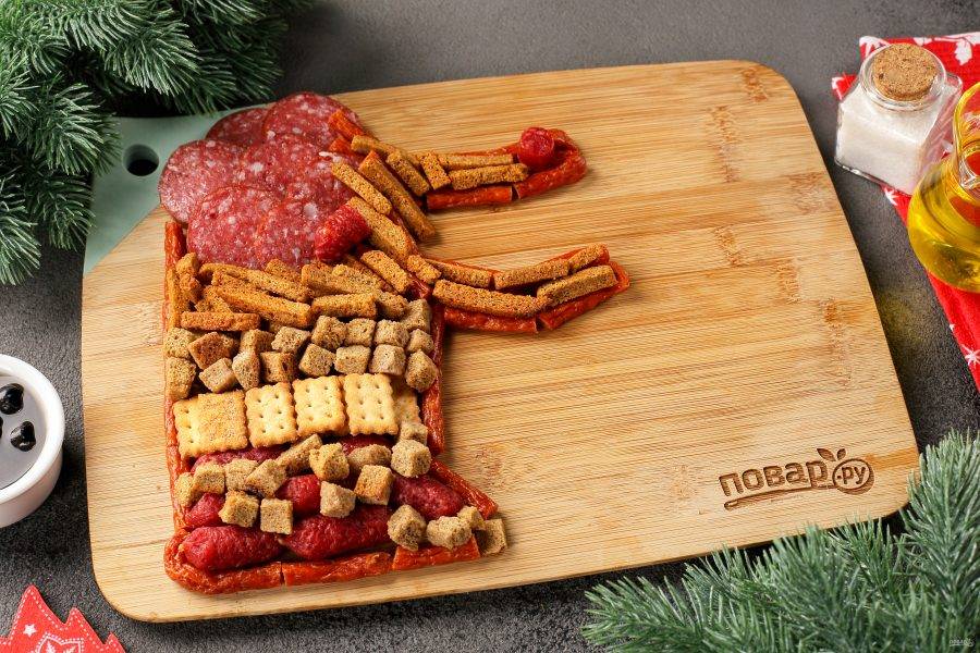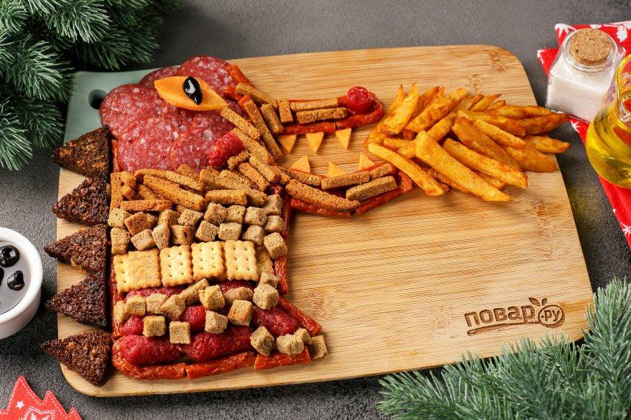 Выкладывать снековую продукцию лучше всего на специальной доске для подачи прямоугольной формы или на плоском блюде подходящего размера. Лучше всего начинать с нарезанных колбасок, наметив голову будущего дракона.