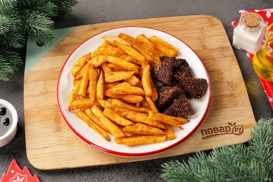 Картофель и сухарики выложите на застеленный пергаментом противень и запеките в духовке при температуре 180-200 градусов до готовности. Лучше всего использовать режим с конвекцией. Либо обжарьте сухарики на сковороде, а картофель во фритюре до румяной корочки сверху. Можете выбрать любой вариант, который вам больше нравится.