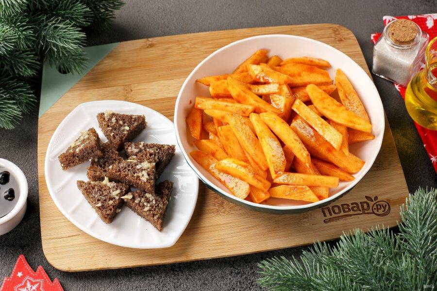 Опустите нарезанные кусочки хлеба на несколько секунд в растительное масло, а затем натрите солью и давленным чесноком. Картофель переложите в глубокую тарелку, добавьте паприку, соль по вкусу и 1 ст.л. растительного масла. Перемешайте.