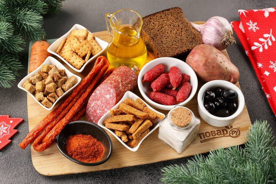 Подготовьте все необходимые ингредиенты. Можете взять любую любимую снековую продукцию. Так же нам понадобится 2-3 ломтика хлеба для гренок и 2-3 клубня картофеля для приготовления картофеля фри, но можете приобрести уже готовую.