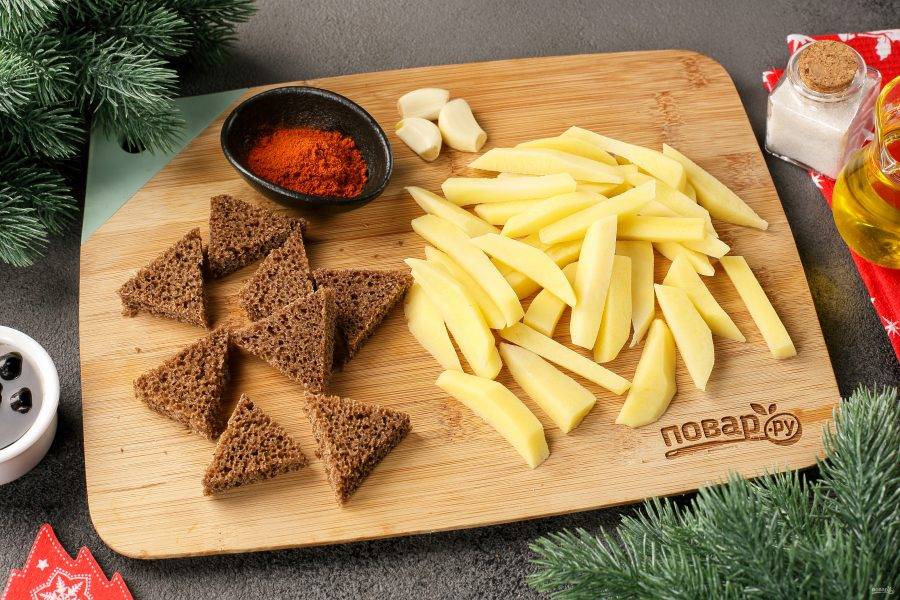 Обрежьте корочки с хлеба и нарежьте мякиш треугольниками. Картофель очистите и нарежьте тонкими брусочками.
