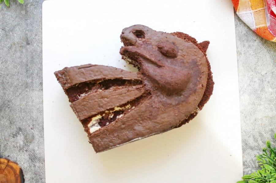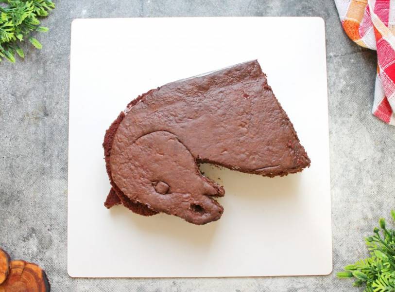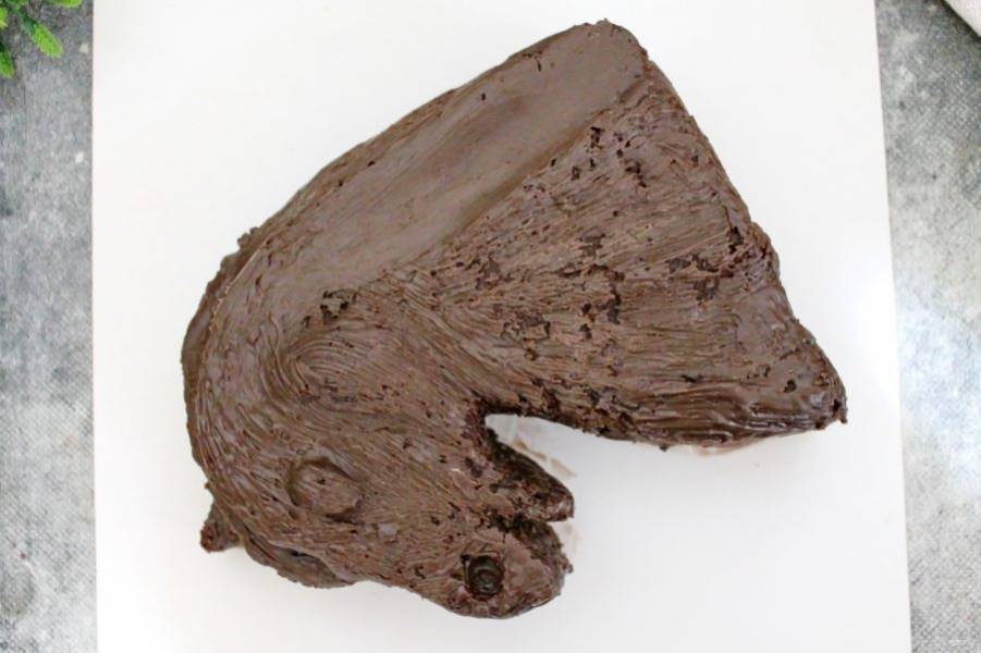 Острым ножом вырежьте торт по обведенному контуру. Срежьте до половины высоты в районе нижнего уха и под скос, где будет грива. Так же вырежьте немного в области ноздри.