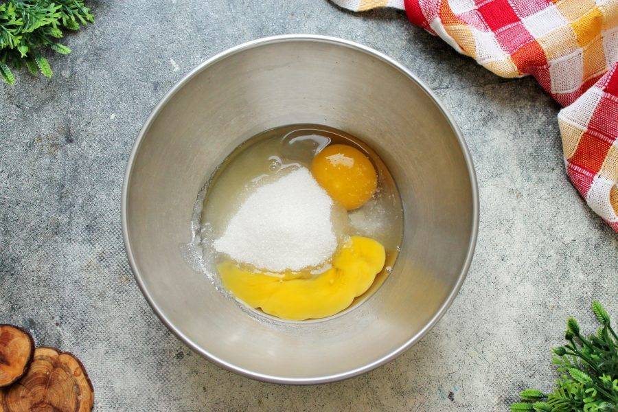 Яйца достаньте из холодильника заранее, чтобы они были комнатной температуры. Вбейте яйца в высокую миску или кастрюлю с толстым дном, так как нам нужно будет нагревать содержимое на огне. Добавьте к яйцам сахар, щепотку соли.