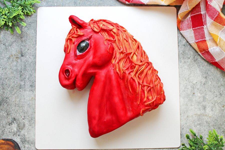 Мастику разомните руками до мягкого состояния. Стол посыпьте крахмалом и раскатайте тонким слоем в пласт, который сможет закрыть всю поверхность торта. Выложите ее на торт и потихоньку, проглаживайте ее пальцами, придавая рельеф головы и шеи. Из остатков мастики сформируйте второе ухо, области газа и ноздри. Прикрепите их при помощи стека, немного смазывая места соединения холодной кипяченой водой кисточкой. После этого сделайте челку и гриву лошади, так же прикрепите ее сбоку.