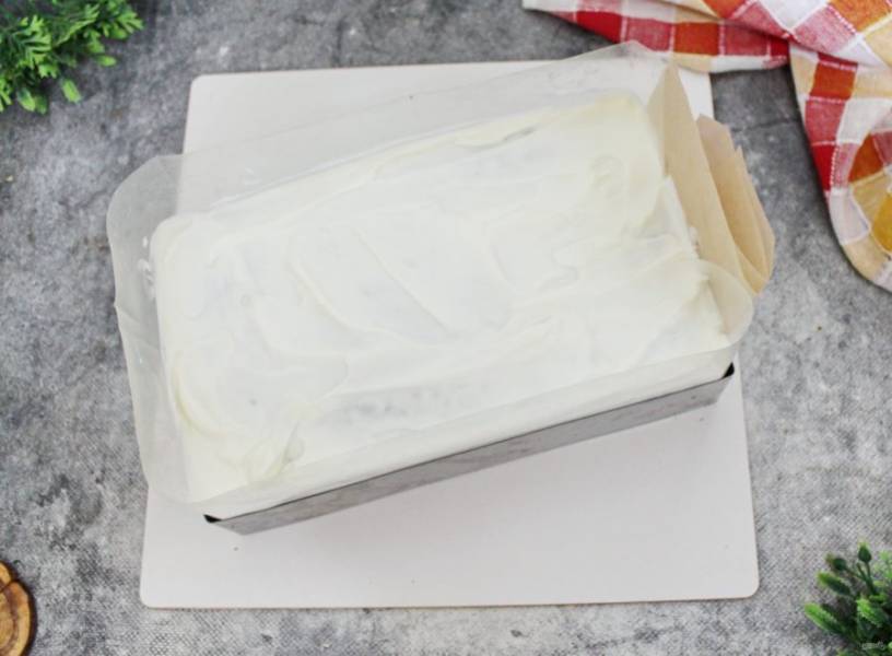 На усиленную подложку, на которой будете подавать торт, установите прямоугольную форму и смажьте немного внутри кремом. Остальной крем разделите на пять частей. Выложите первый корж и смажьте одной частью крема ровным слоем. Снова корж, затем крем и так далее. Верхним коржом должен быть корж с трафаретом и его не смазывают. Накройте торт пленкой и уберите его в холодильник на 8 часов для стабилизации.