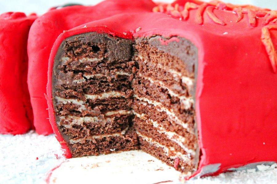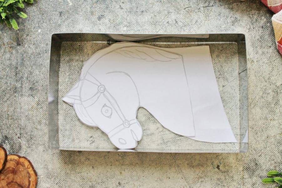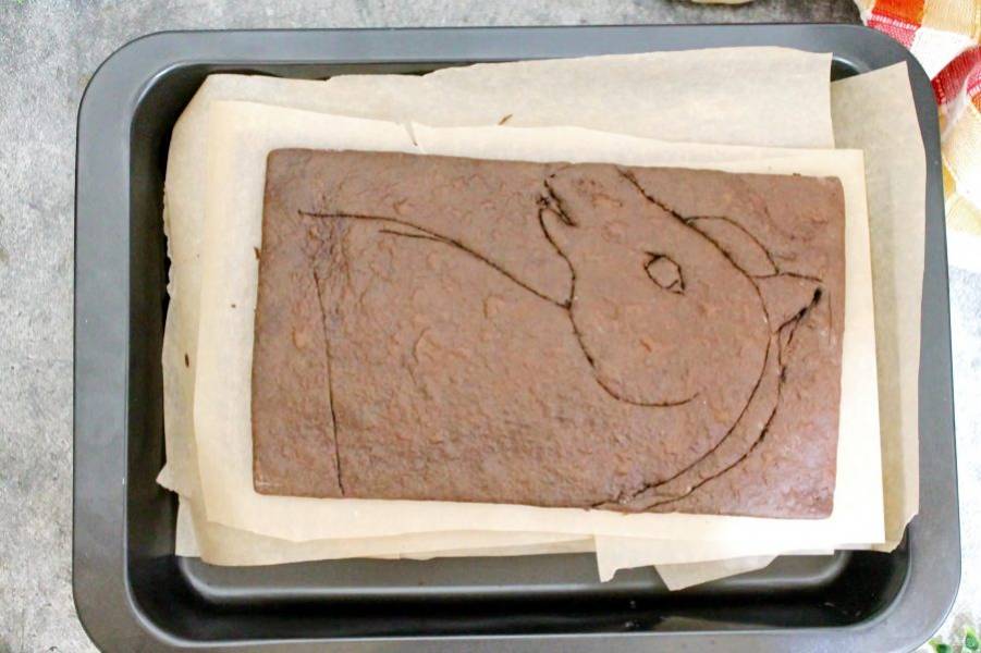 Разделите тесто на 6 частей и раскатайте каждый в прямоугольник на пергаменте толщиной 2 миллиметра, чуть больше прямоугольной формы. Прорежьте формой прямоугольник и уберите лишнее тесто. На один из коржей выложите трафарет и стеком или тупой стороной ножа обведите все очертания лошади. Выпекайте в горячей духовке при температуре 180 градусов в течение 6-7 минут. После этого снимите корж с противня и выложите на деревянную доску или поддон. Каждый корж проложите пергаментом и накройте полотенцем. Дайте коржам полностью остыть. Если торт не будете делать сразу после этого, обверните коржи пленкой и уберите в холодильник. В таком виде они могут храниться в холодильнике до двух недель.