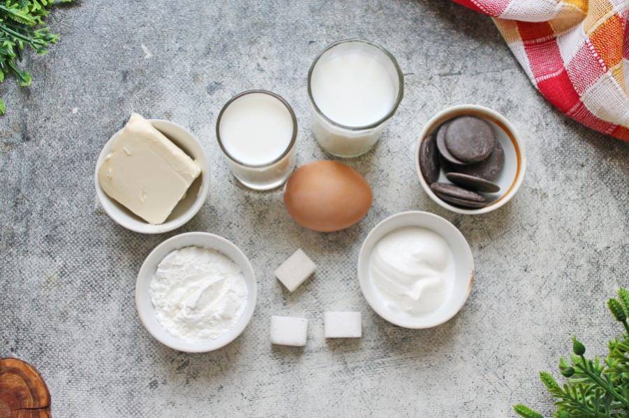 После того как переложите тесто в холодильник, начинайте делать первую часть заварного крема. Для этого подготовьте все необходимые ингредиенты для приготовления заварного сметанного крема и шоколадного ганаша.